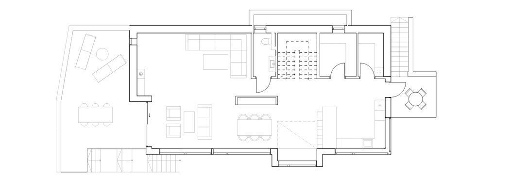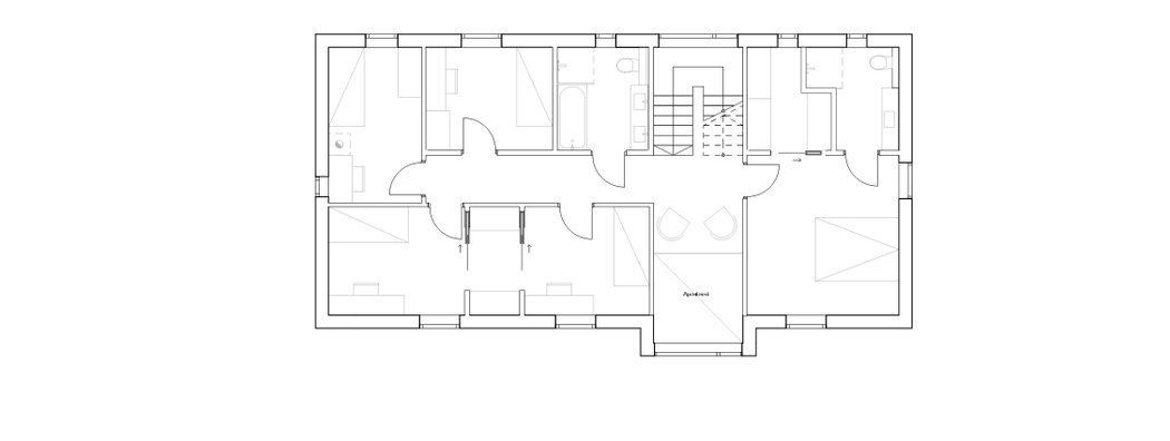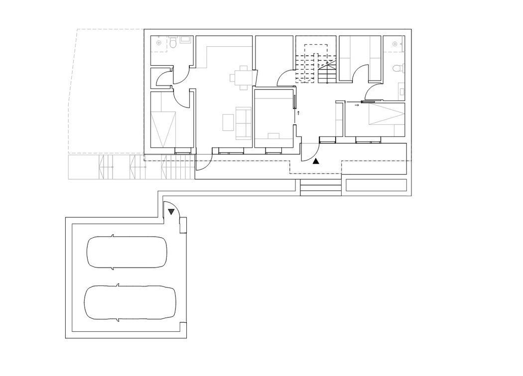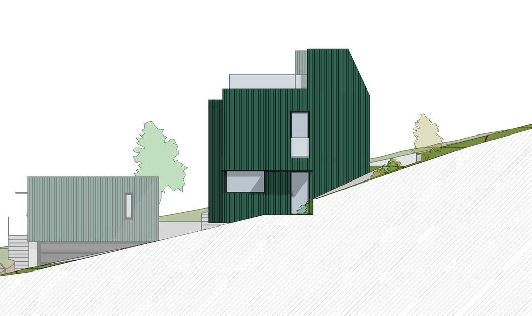 Smal tomt i bratt, sør-vendt skrent. Enebolig tegnet for en familie på syv med muligheter for uteleie av deler av 1. etg.