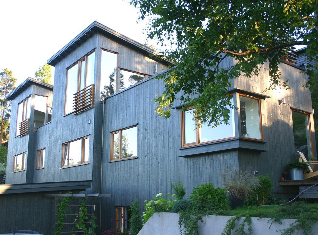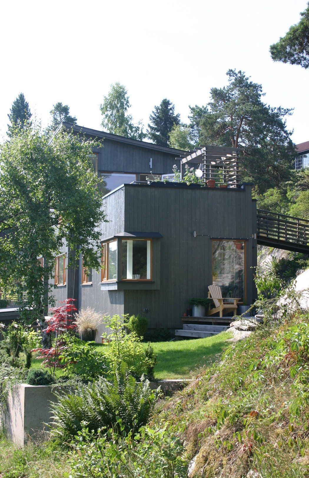 Smal tomt i bratt, nordøstvendt skrent.  Utviklet med to 3-plans leiligheter. Store takterrasser på plan 3 gir utendørs oppholdsareal med utsikt mot sjøen og godt med kveldssol, på tross av vanskelig orientering. Bygget er kledd med beiset låvepanel. Taket er tekket med sedum, en ”levende” tak som skifter farge med årstidene.