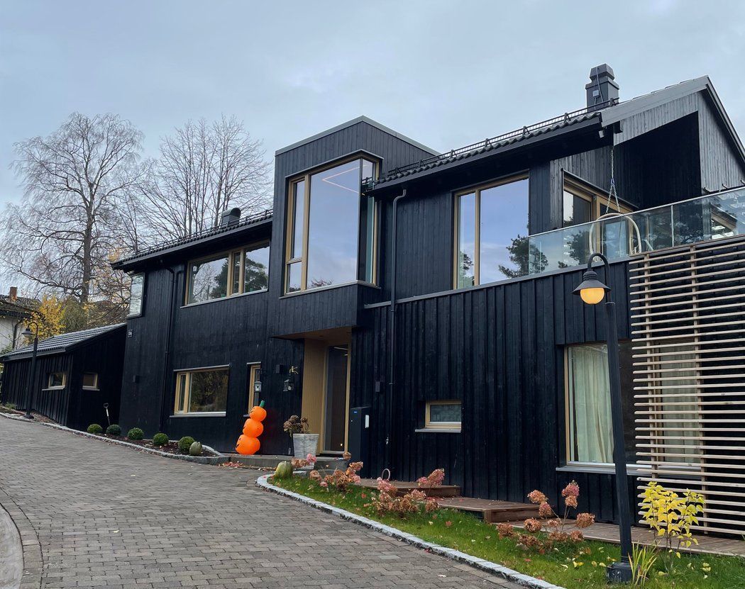 Huset har to etasjer og ligger i skrående terreng.