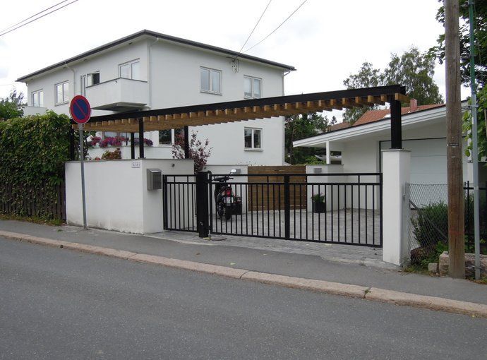 Prosjektet på Bygdøy bestod i å etablere en ny atkomstsituasjon for eiendommen. Atkomsten ble definert av en hvitmalt mur med ny dobbel port i svartlakkert rustfritt stål. Over portene er det etablert en pergola i stål med underliggende spilehimling i behandlet furu.