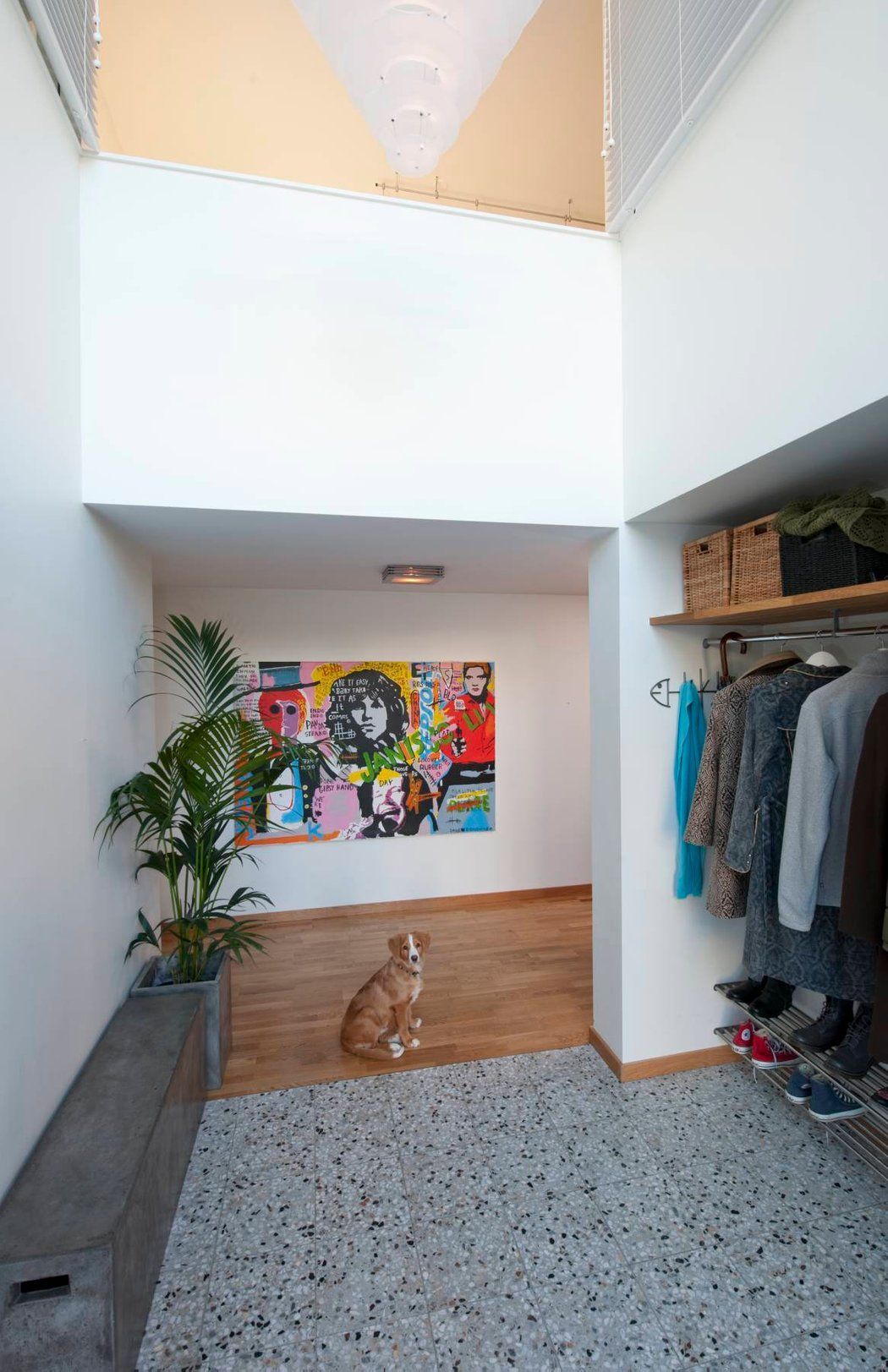 Tiltakshaver ønsket en ny og mer luftig inngangssituasjon, bedre garderobeforhold, nytt bad og vaskerom. Løsningen ble å etablere en adkomsthall med to etasjers høyde. Via det store nye vinduet gir hallen dagslys til nytt baderom og nytt gjesterom på øvre plan. Det er åpent mellom galleriet oppe og hallen nede.